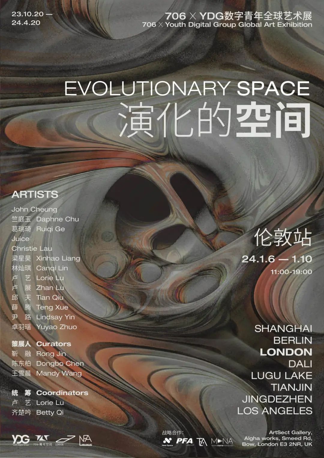 Based on this concept, YDG is collaborating with the 706 Global Youth Space Community to organize the exhibition "Evolving Space". The exhibition, which is scheduled to tour globally in multiple cities, aims to create a revolutionary form of spatial art exhibition by establishing a synchronized connection between communities through multi-sensory digital media. 2023, the exhibition venues in Shanghai and Berlin successfully presented different digital explorations based on the theme of "Evolving Spaces" in October, December, and January, and the third stop of the global tour will be the "Unclear Covariates" exhibition. The third stop of the global tour, Unspecified Covariates, will be held from January 6 to 10, 2024 at the ArtSect Gallery in London.